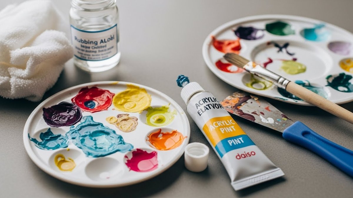 ダイソーのアクリル絵の具は手軽で使い勝手が良い反面、扱い方や保管で差が出ます。まず乾燥状態を見極め、まだ湿っている場合は素早く拭き取り、乾いている場合は素材に合わせた方法で慎重に処理してください。