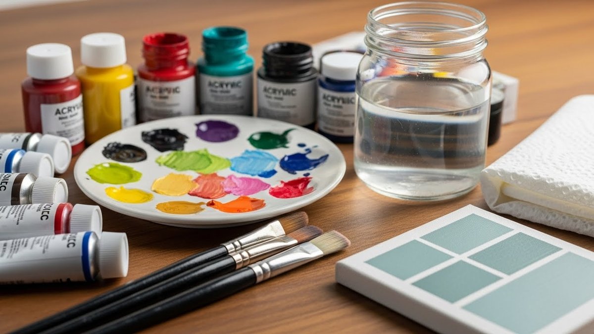 道具は最初から高価なものを揃える必要はありません。まずは使い勝手を確かめながら、筆はサイズ違いを数本、パレットは洗いやすいものを選びましょう。ペットボトルのキャップなどで分量を試すのも便利です。