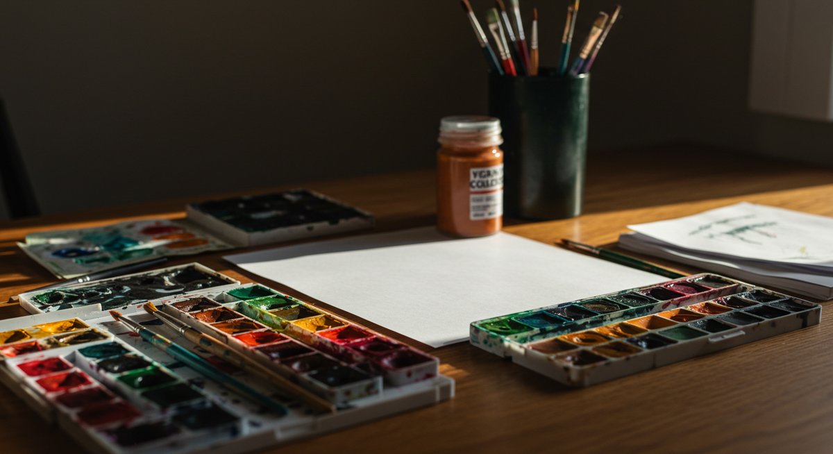 種類としては、透明水彩と不透明水彩(ガッシュ)があります。初心者が選ぶ場合は、手軽に使える固形(パン)タイプのセットや、チューブタイプがおすすめです。12色程度の基本セットから始めると、色の混色も学びやすくなります。使う紙は水彩紙が適しており、発色やにじみを活かすことができます。