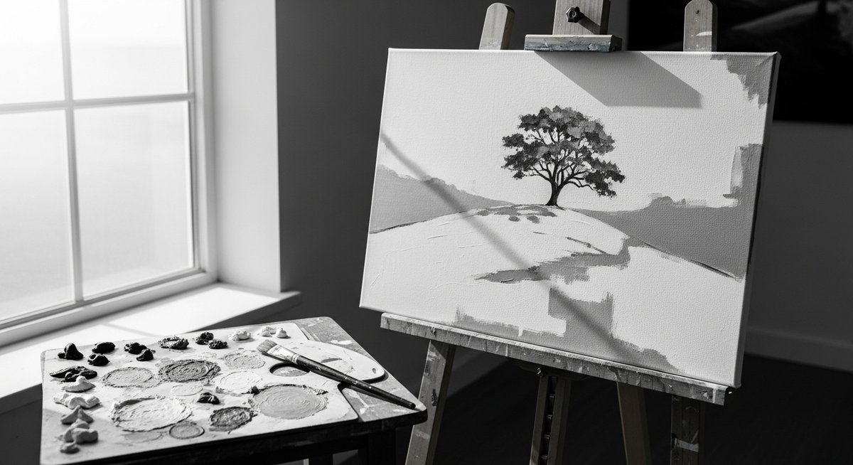 アナログの場合は、キャンバスや板、グレージュ系のアーストーン、白と黒の絵具、各種筆、パレットナイフ、溶剤や乾燥媒材があると便利です。下地を整えるためのジェッソや下塗り材も用意しましょう。描き直しや修正を考えると、複数サイズの筆や布、削り用の工具もあると安心です。
