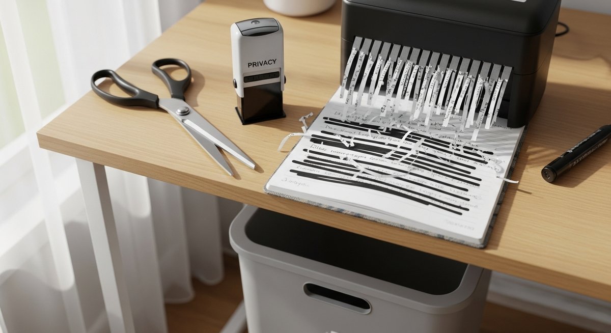 シュレッダーを使わない場合でも、複数の手法を組み合わせることで高いセキュリティを実現できます。まずは黒い油性マーカーやスタンプで重要な記述を完全に隠します。その上で、ページを縦横バラバラに破り、それらを一つのゴミ袋にまとめず、数回に分けて、あるいは別の場所のゴミ袋に分散させて捨ててください。