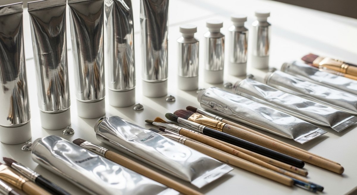 市販の銀色絵の具には、メタリック顔料入り、パール系、ラメ入りなどがあります。使いやすさや仕上がりのテイストで選んでください。アクリルベースは扱いやすく、油絵具は深みのある仕上がりになります。