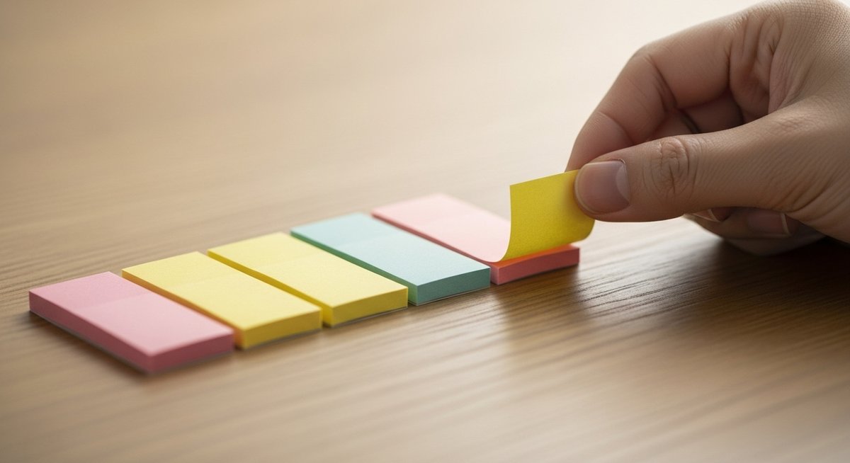 毎日使う付箋は、ちょっとした習慣で扱いやすくなります。剥がすときは必ず横方向を意識し、端を丁寧につまんでゆっくり引くことを基本にしてください。小さいものや本に貼ったものは補助道具を使うと失敗が減ります。