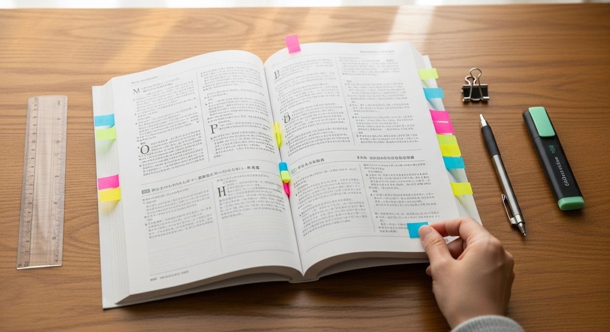 章の中で特に重要なページは短い付箋で細かくマークしておくと、必要な箇所だけ素早く開けます。分厚い本は持ち運びも重くなるため、頻繁に見るページだけを外側に残すルールを作ると負担が減ります。